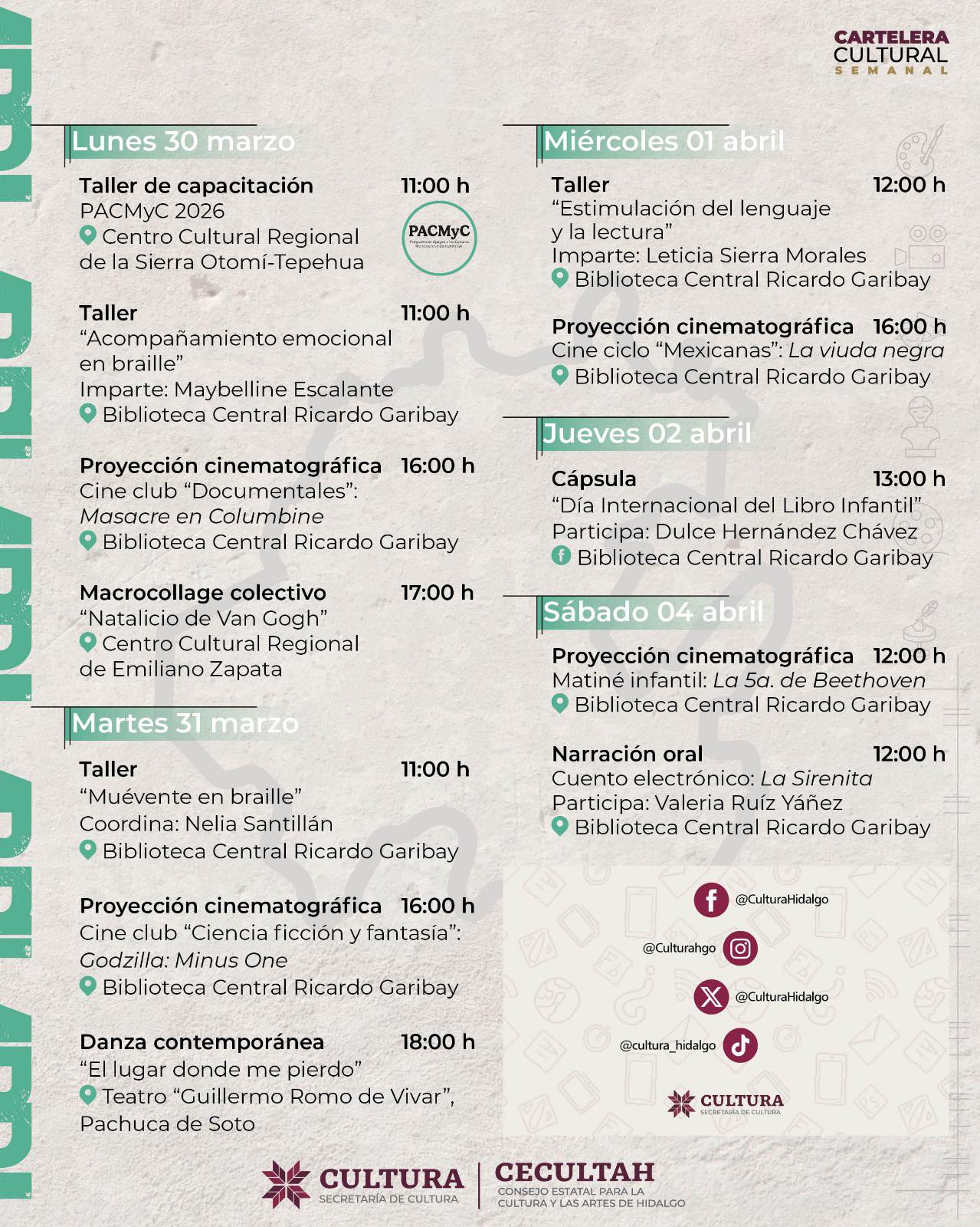 Cartelera cultural del 30 de marzo al 04 de abril 2026